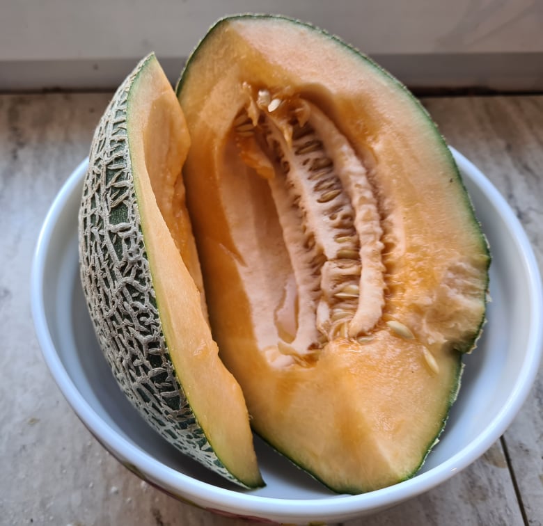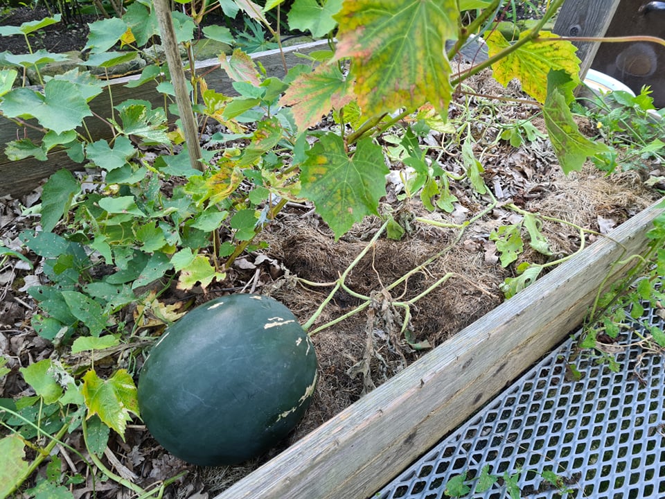 С утра сняла одну дыню, вторая не успела вырасти. Посадила в неудачное место, солнца почти не было, да и до полива руки не доходили. Взвесить не успела, мои разрезали её пока я была на работе. Сладкая и видимо переспела. Такая вот осталась висеть. Сниму, всё равно с такой погодой она не растёт. Может чуть дома дозреет, пойдёт на смузи Также сняла последний арбуз, ботва от холода тоже засохла. Лежит пока дома. Не взвешивала. Первый снимали недели 2 назад, был 1кг 900г, сорт Сибирские огни