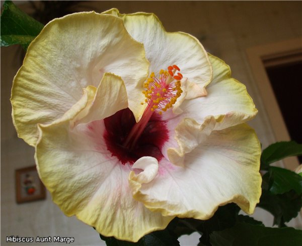 Прошлогоднее фото - вот. к сожалению, сейчас он совсем не презентабельный:длинный голый ствол, семь листочков наверху и цветок на макушке... прям первоклашка-акселерат с огромным желтым бантом. А серединка у него темно-бордовая.
