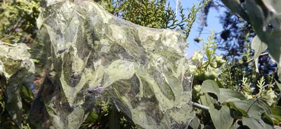 Листья сильно обмотаны паутиной и по ней внутри ползают гусеницы. У шелкопряда и паутина-то не всегда бывает, а если бывает то попроще, чем у американской бабочки.