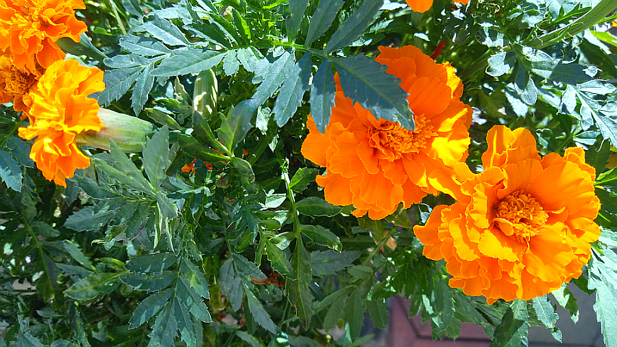 Бархатцы махровеют, алиссум на лоджии решил начать цвести. А что такое выросло на улице...я не могу понять. Календула? Но остальные цветки календулы другие.