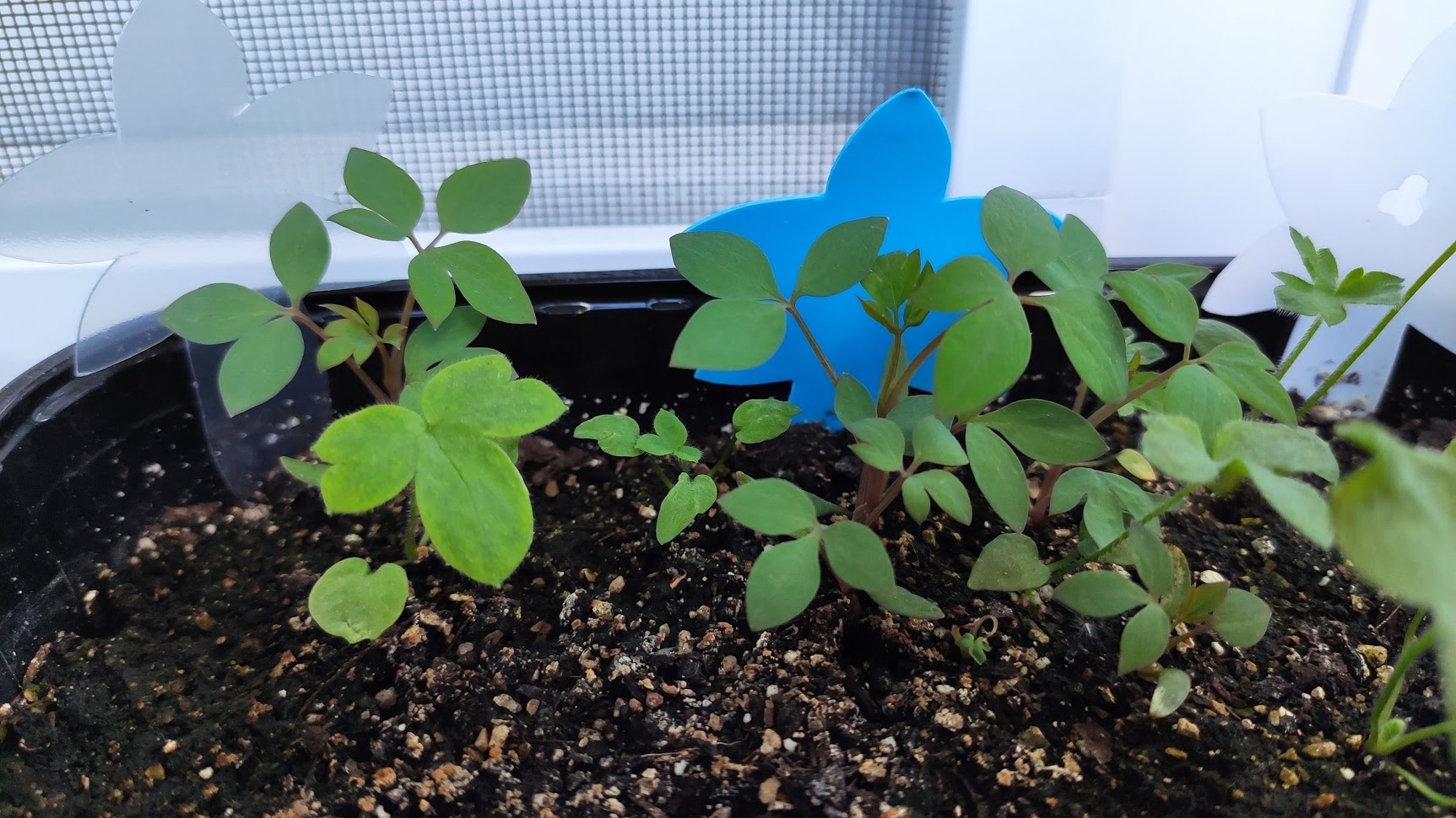 Взошла дицентра великолепная, первый раз удалось получить всходы. (Другие сеянцы в той же коробочке - дельфиниумы.)