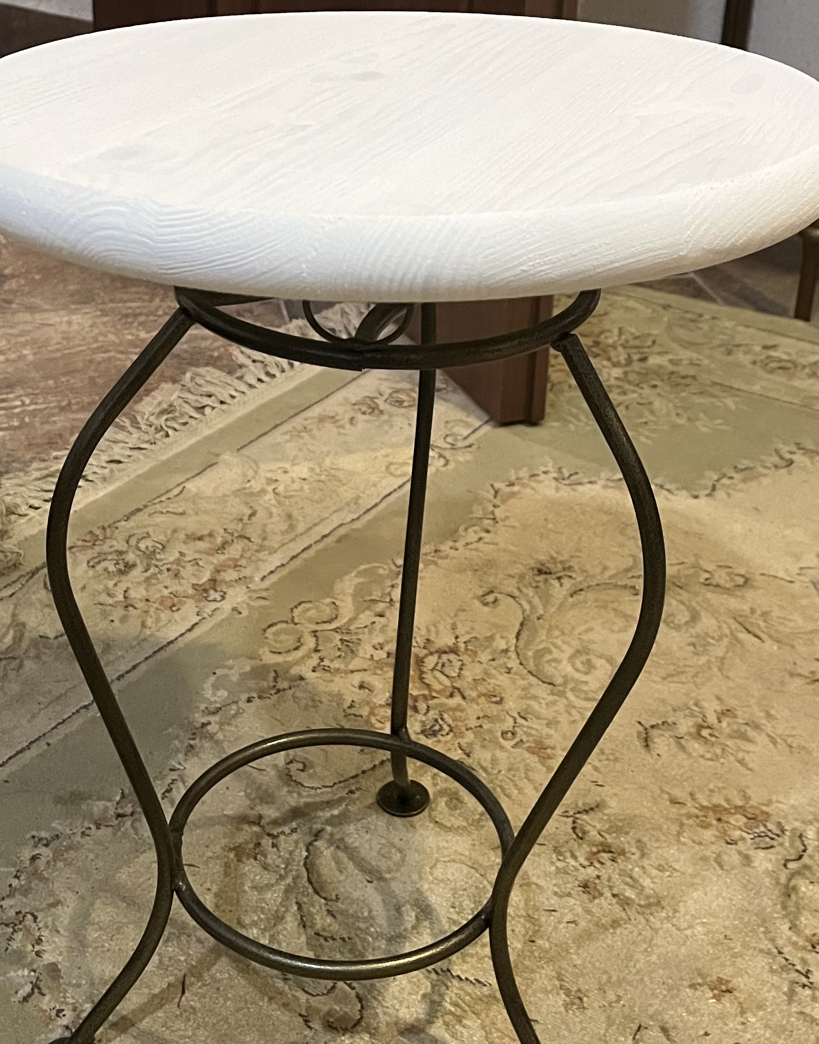 И вот -кружок «очумелые ручки»! Заказали на озоне эту вот круглую деревянную столешницу покрасили в белый цвет (еще немного потертости добавили для натуральности) муж прикрутил ее к металлической подставке и вуаля.