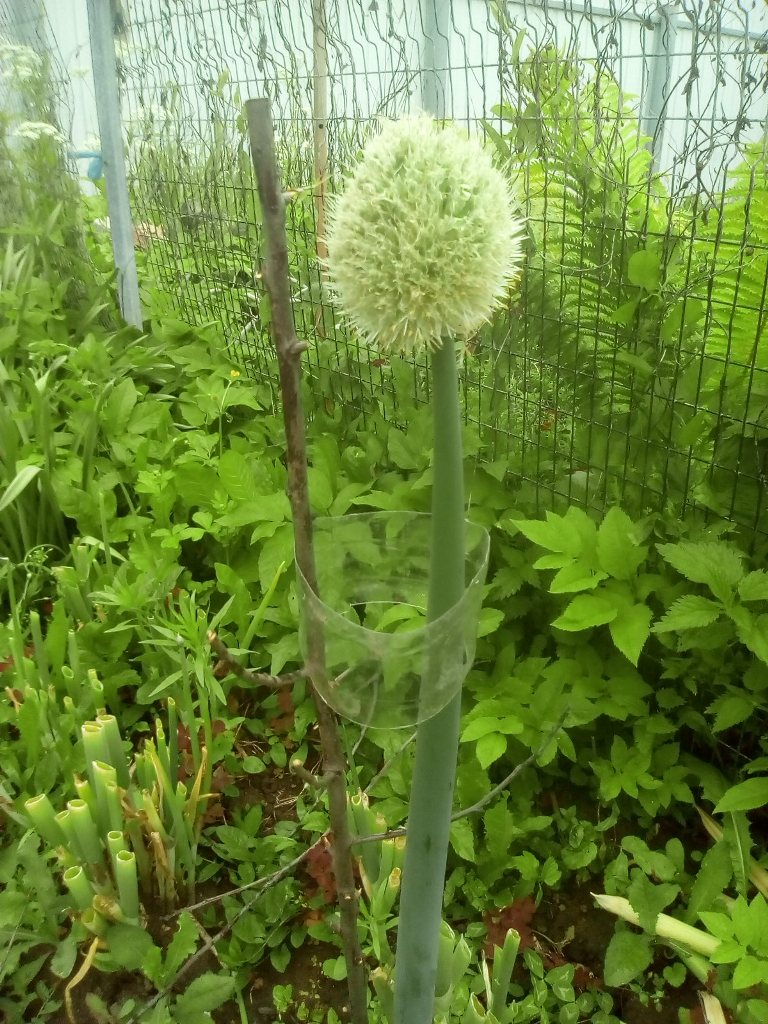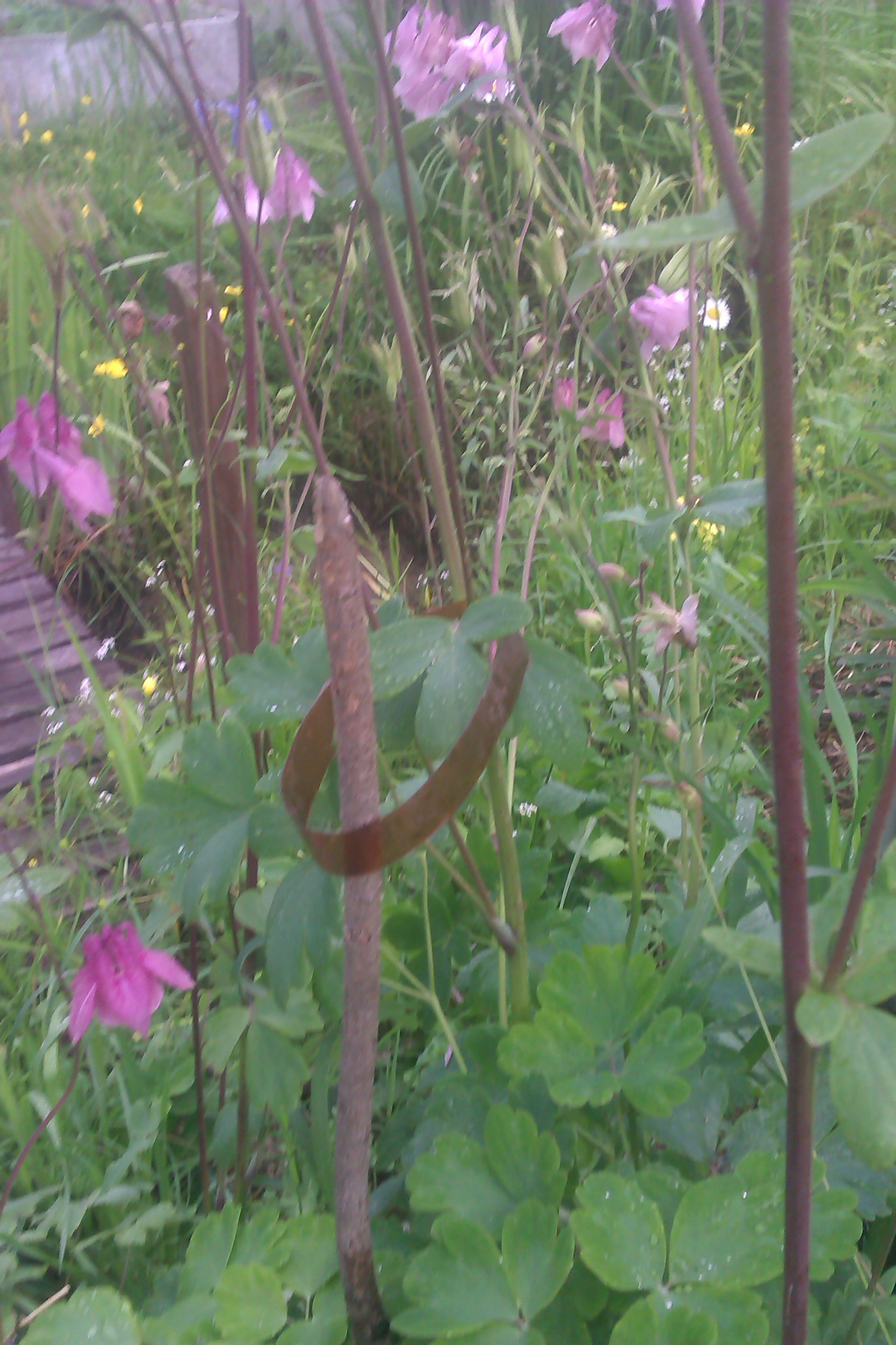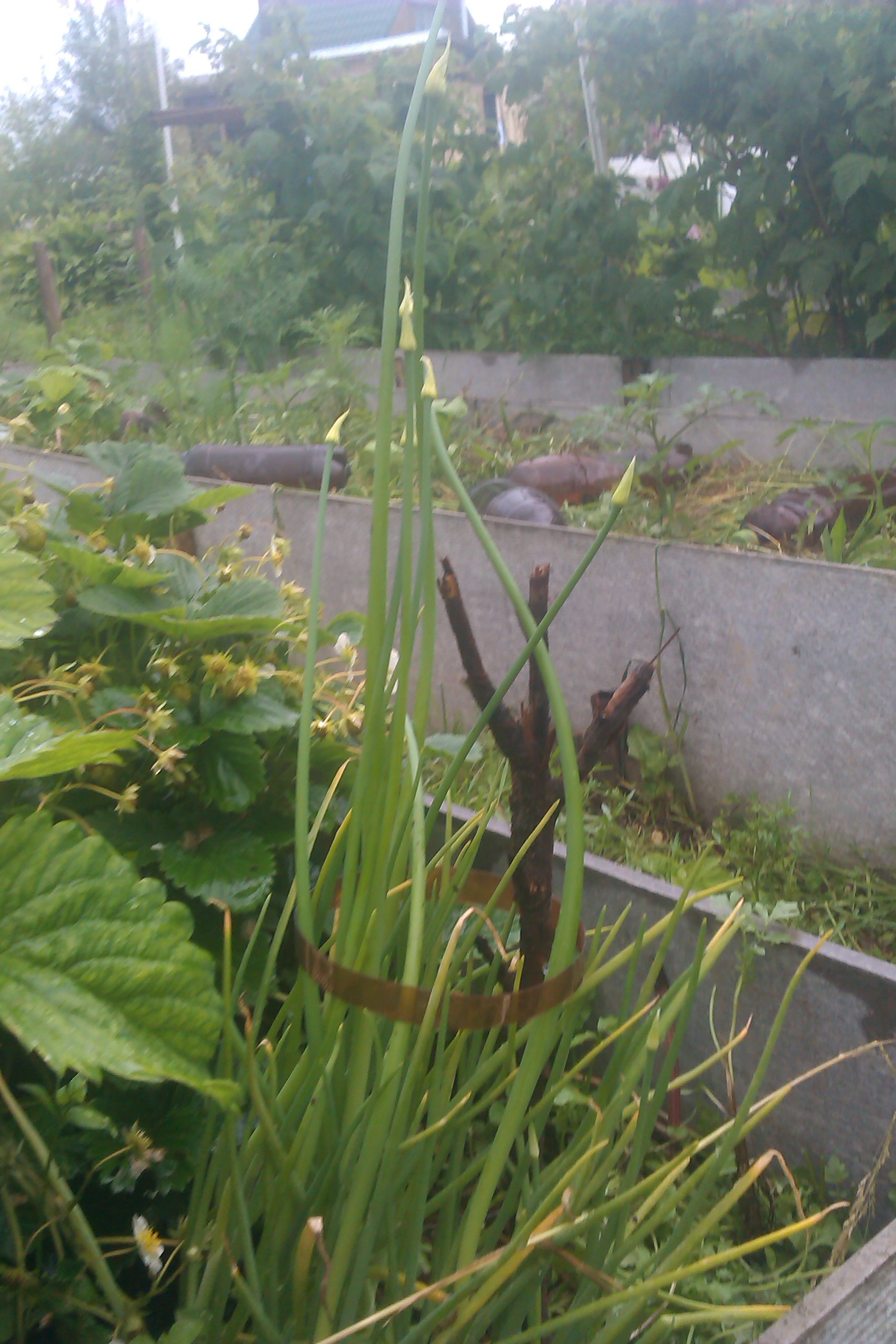 Например, надо подвязать стрелку лука или соцветие дельфиниума. Втыкаем рядом с растюхой палку и накидываем на палку и растение кольцо. Создается не жесткое соединение, которое позволяет растюхе колебаться на ветру, но в тоже время удерживать равновесие.